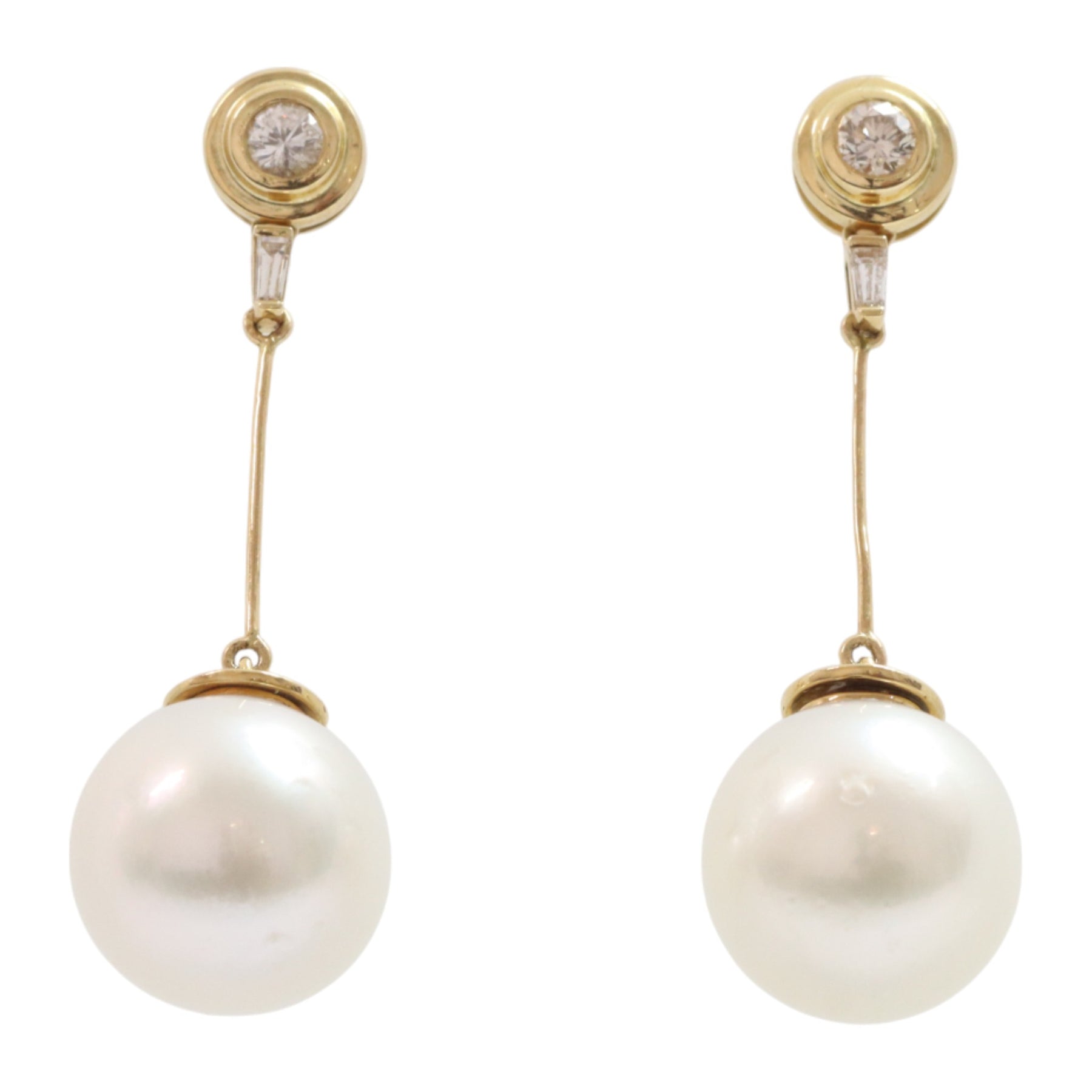 One pair of 18k yellow gold ladies earrings featuring two round brilliant cut diamonds, bezel set, colour H-J, clarity SII-I as well as two tapered baguette cut diamonds, channel set, colour H-I, clarity SIl-SI2 and two white South Sea pearls. The pearls are 13.17-13.37mm in diameter, slightly blemished, thick nacre and medium - high lustre. The earrings are a round bezel set diamond stud, with a pendant drop of one tapered baguette diamond, a tube post and South Sea pearl respectively. The earrings measure 43mm x 13.37mm and feature post backs with butterfly clasps.