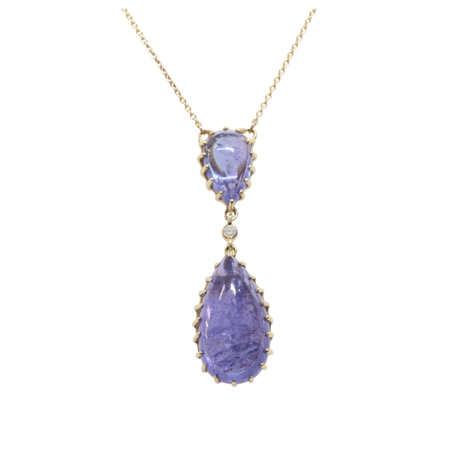 Beautifully designed 14CT YG double drop pear shaped Tanzanite pendant/necklace with an elegant touch set of round brilliant cut diamonds, polish finished with parrot clasp.