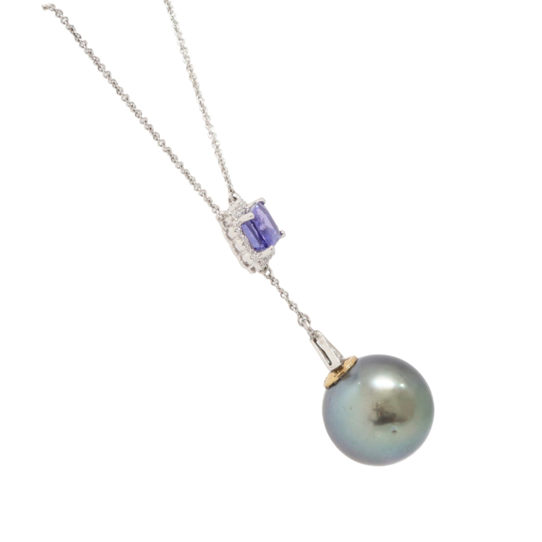 One 18k white gold pendant featuring one 1.71ct Tanzanite, rectangular emeralds cut, four claw set, with one 14.14mm Tahitian pearl, near round, grey with brown/green overtones, slightly blemished, medium nacre, medium lustre, with twenty-four round brilliant cut diamonds, micro-claw set, colour G-H, clarity SI-I.