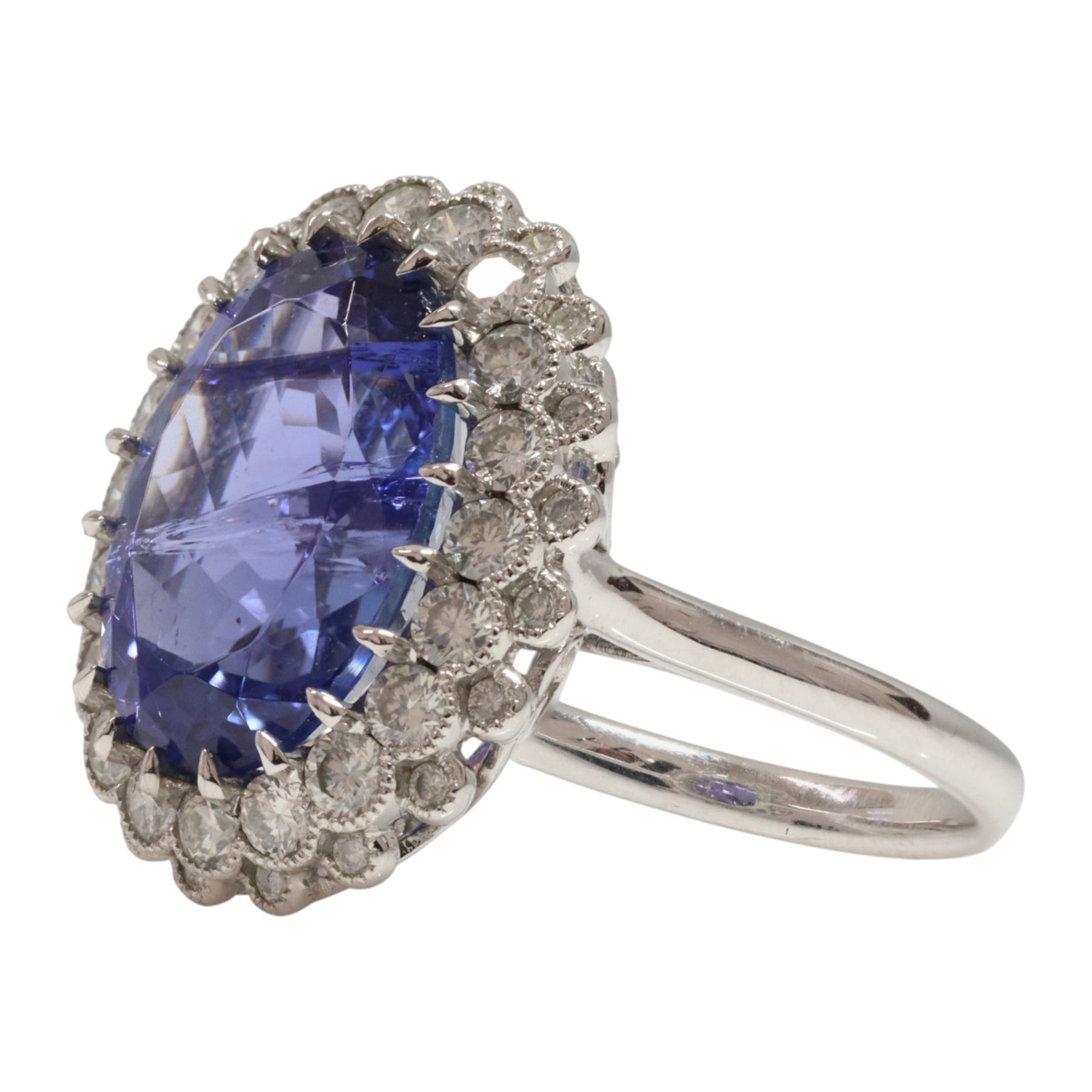 PT950 Tanzanite and diamond dress ring featuring one (1) oval shape claw set Tanzanite surrounded by double halo cluster design include forty (40) round brilliant cut milgrain edge bezel sot diamond on a filigree design basket setting with an underail and upswept shoulder 2.1mm half round band.