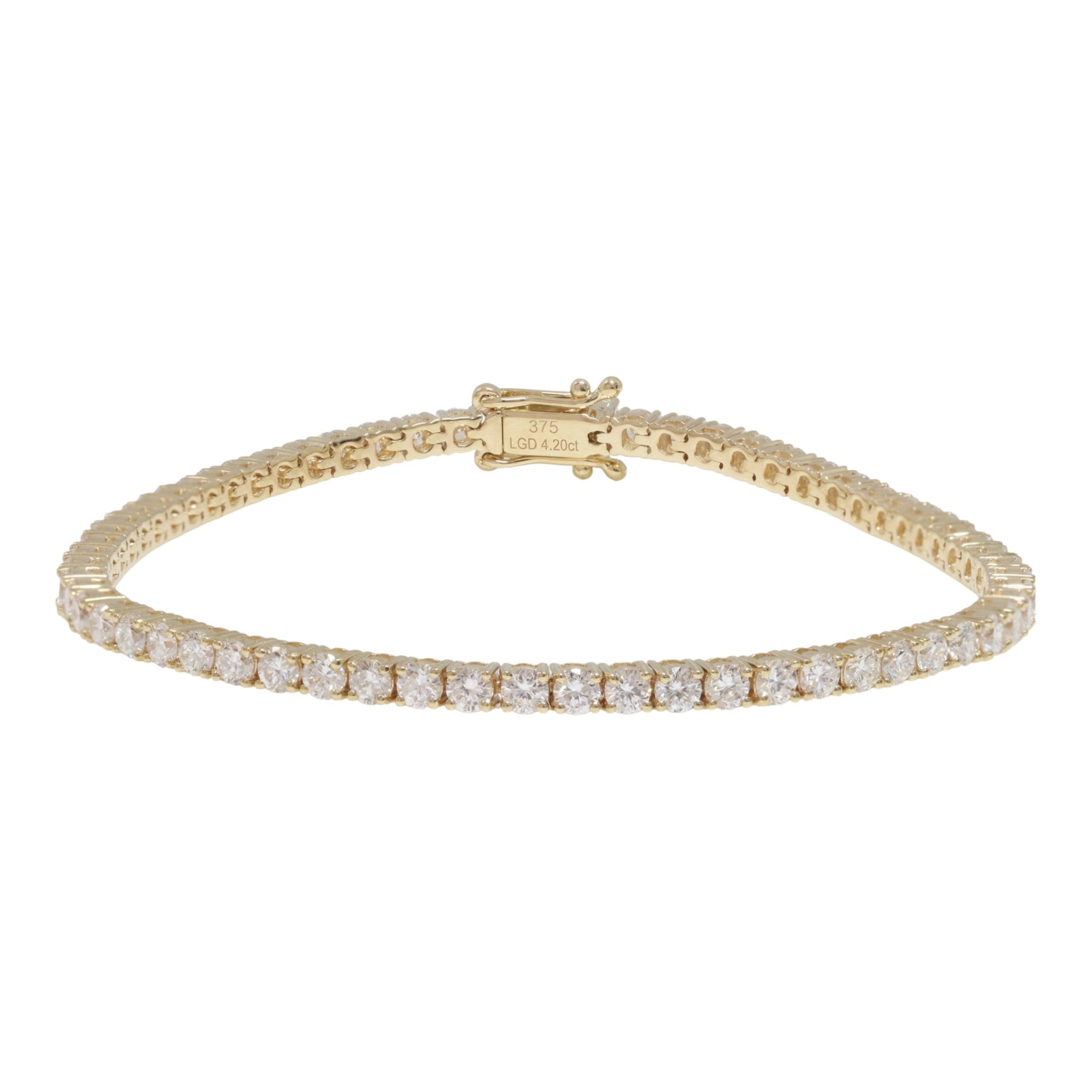 One ladies - 9ct yellow gold tennis bracelet, polished finish, stamped (375, LGD 4.20ct), with box clasp two figure 8 safety catches. The item contains: